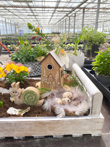 Wer lieber fertige Dekoration sucht, findet eine große Auswahl an handgemachter Osterfloristik sowie erntefrischen Frühjahrsblühern wie Primeln und Hornveilchen direkt aus eigenem Anbau.
