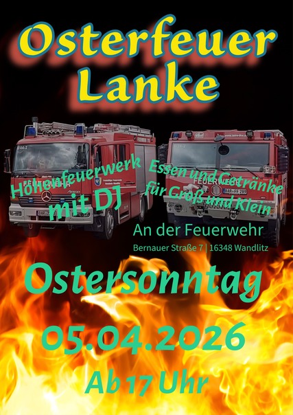 Am 05. April 2026 ab 17 Uhr lädt die Freiwillige Feuerwehr Lanke zum Osterfeuer und einem gemütlichen Frühlingsabend ein. Die Veranstaltung findet hinter der Feuerwehr Lanke, Bernauer Straße 7 in 16348 Wandlitz, statt.