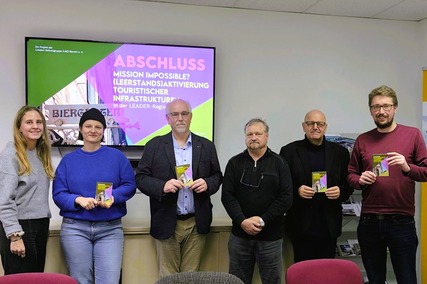 1 Übergabe der Projekt-Ergebnisse durch Tina Steinke und Annika Bange von LOKATION:S (links) an Bernd Skudelny (Geschäftsführer, WITO Barnim) und Burkhard Horn (Vorstandsvorsitzender, LAG Barnim) sowie Torsten Jeran und David Sumser (Regionalmanagement, LAG Barnim) / Fotografin: Natalie Wilk